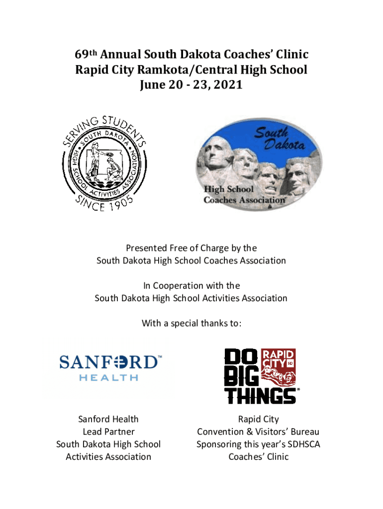 69th Annual South Dakota Coaches Clinic Rapid City Dakota/Central High School June 20 23, 2021Presented Free of Charge by the South Dakota High School Coaches Association In Cooperation with the South