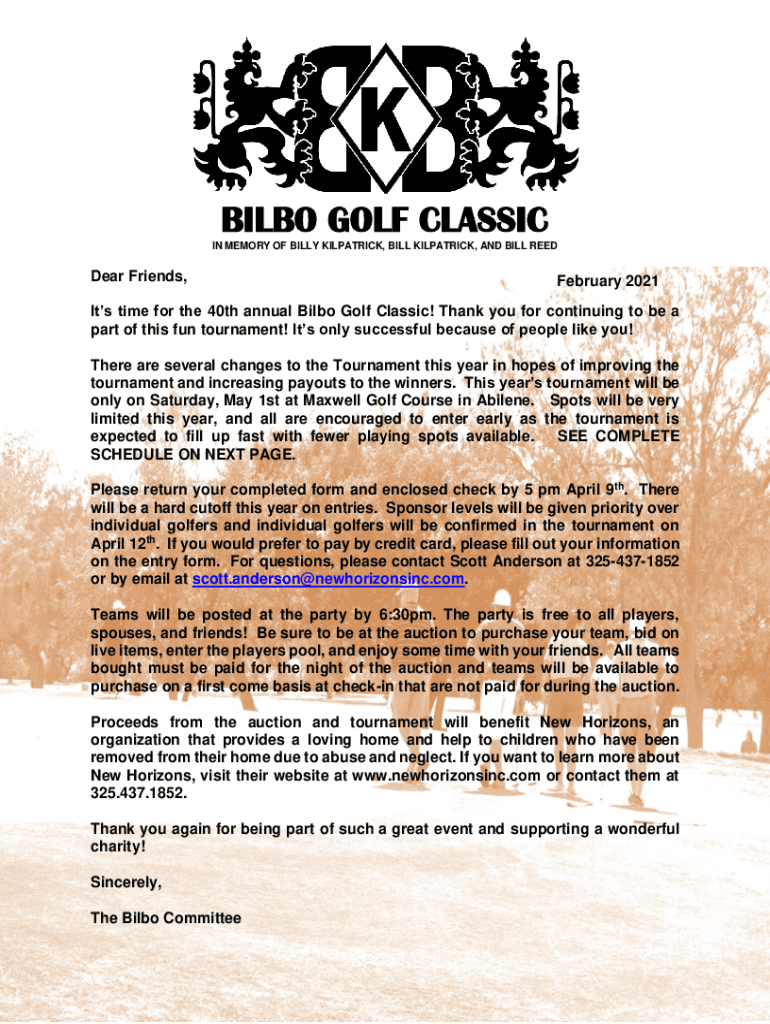 BILBO GOLF CLASSIC IN MEMORY OF BILLY KIRKPATRICK, BILL KIRKPATRICK, AND BILL Reedier Friends, February 2021Its time for the 40th annual Bilbo Golf Classic! Thank you for continuing to be a part of