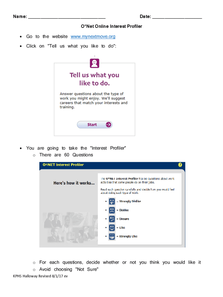 Name: ___Date: ___O×Net Online Interest Profiler Go to the website www.mynextmove.orgClick on \” Tell us what you like to do\”:You are going to take the \” Interest Profiler\” o There are