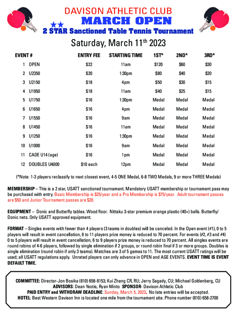 DAVISON ATHLETIC CLUB MARCH OPEN2 STAR Sanctioned Table Tennis Tournament Saturday, March 11th 2023 EVENT #ENTRY RESTARTING TIME1ST×2ND×3RD×1 OPEN$2211am$$$12060302 U$2350201:30pm$$$8040203 U$2150184pm$$$5030154