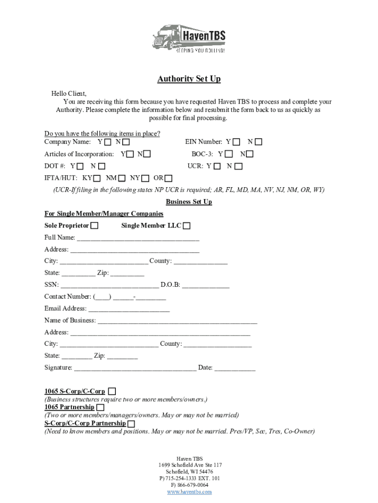 Authority Set Up Hello Client, You are receiving this form because you have requested Haven TBS to process and complete your Authority. Please complete the information below and resubmit the form