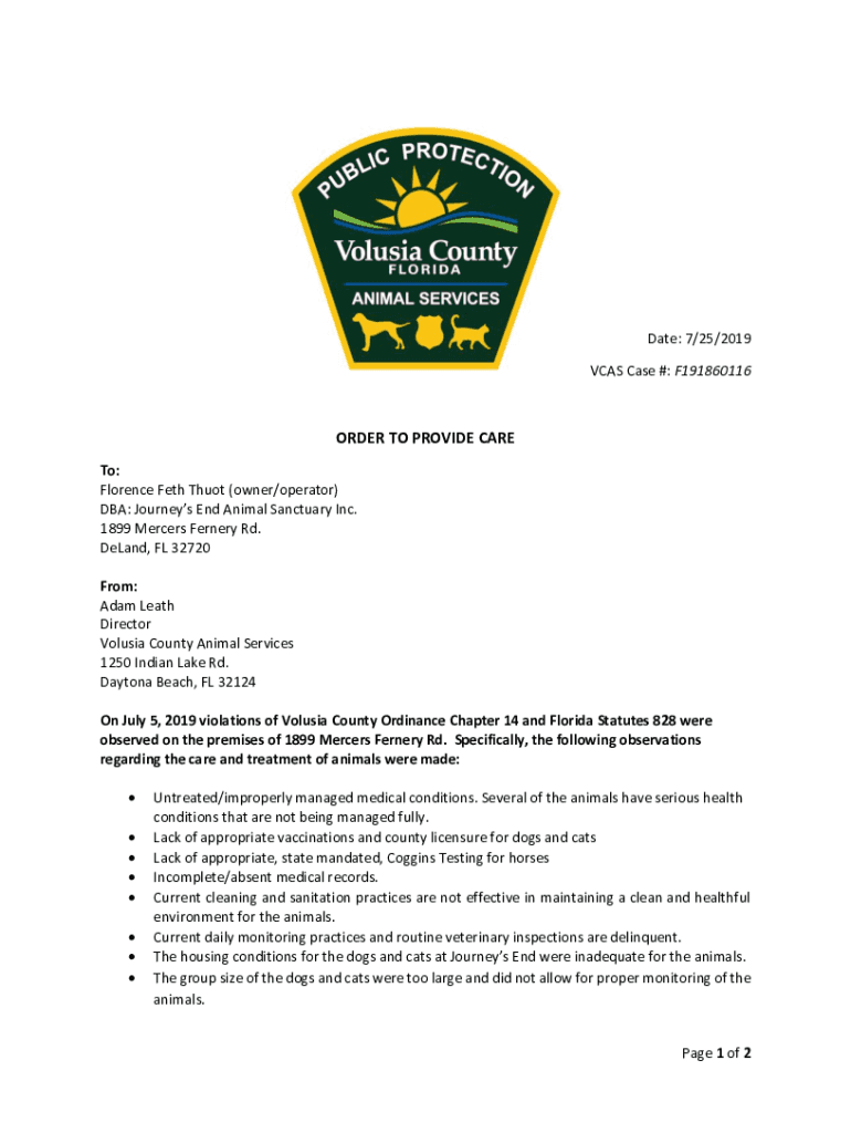 Date: 7/25/2019 TCAS Case #: F191860116ORDER TO PROVIDE CARE To: Florence Seth That (owner/operator) DBA: Journeys End Animal Sanctuary Inc. 1899 Mercers Ferry Rd. Demand, FL 32720 From: Adam Death