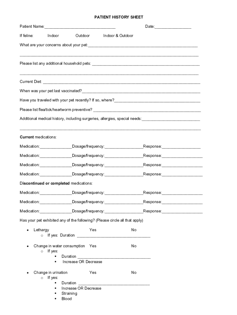 PATIENT HISTORY SHEET Patient Name:___ If feline:IndoorOutdoorDate:___Indoor & OutdoorWhat are your concerns about your pet:___ ___ Please list any additional household pets: ___ ___ Current Diet: