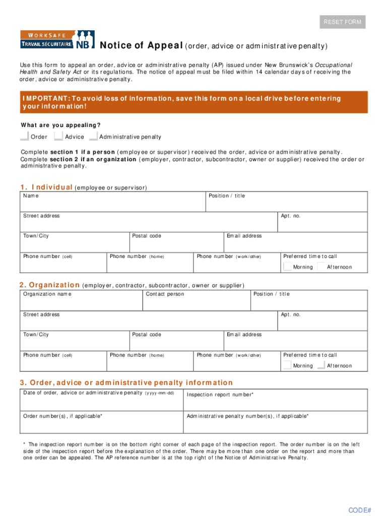 RESET Formative of Appeal (order, advice or administrative penalty) Use this form to appeal an order, advice or administrative penalty (AP) issued under New Brunswick's Occupational Health and Safety