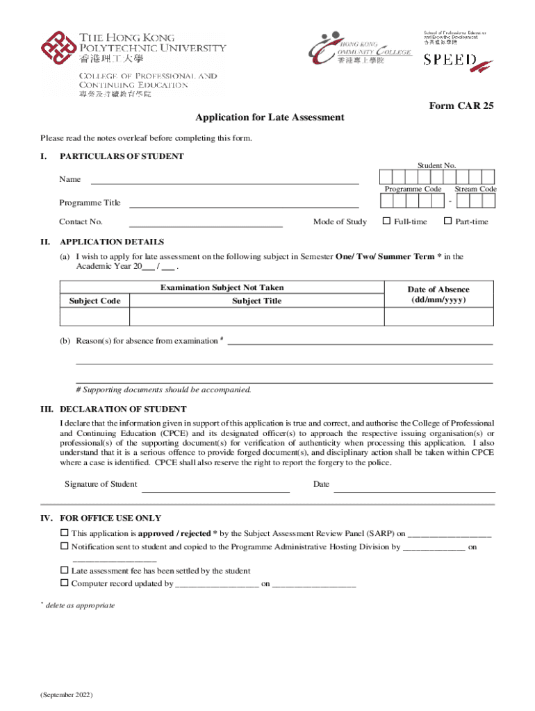 Form CAR 25 Application for Late Assessment Please read the notes overleaf before completing this form. I.PARTICULARS OF STUDENT No. Name Program Deprogrammed Title Contact No. II. Stream Commode