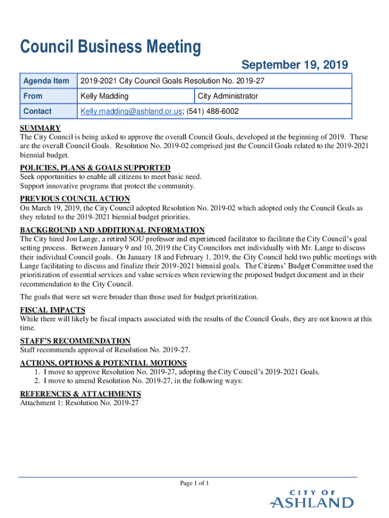 Council Business Meeting September 19, 2019, Agenda Item20192021 City Council Goals Resolution No. 201927FromKelly MaddingContactKelly.madding@ashland.or.us; (541) 4886002City AdministratorSUMMARY