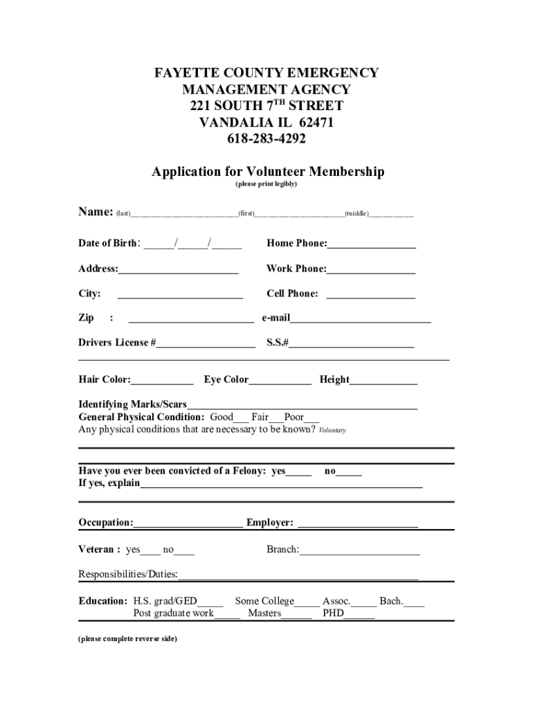 FAYETTE COUNTY EMERGENCY MANAGEMENT AGENCY 221 SOUTH 7TH STREET VANDAL IA IL 62471 6182834292 Application for Volunteer Membership (please print legibly)Name: (last)___(first)___(middle)___ Date of