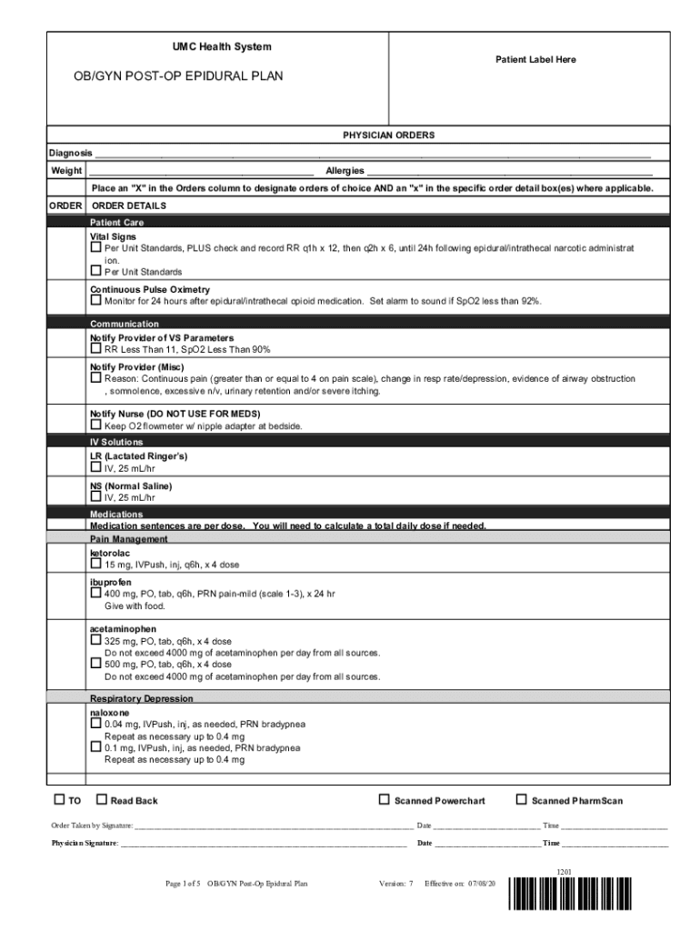 UMC Health System Patient Label Carob/GUN POS TOP EPIDURAL PATAPHYSICIAN ORDERS Diagnosis ___ Weight ___Allergies ___Place an \” X\” in the Orders' column to designate orders of choice AND an