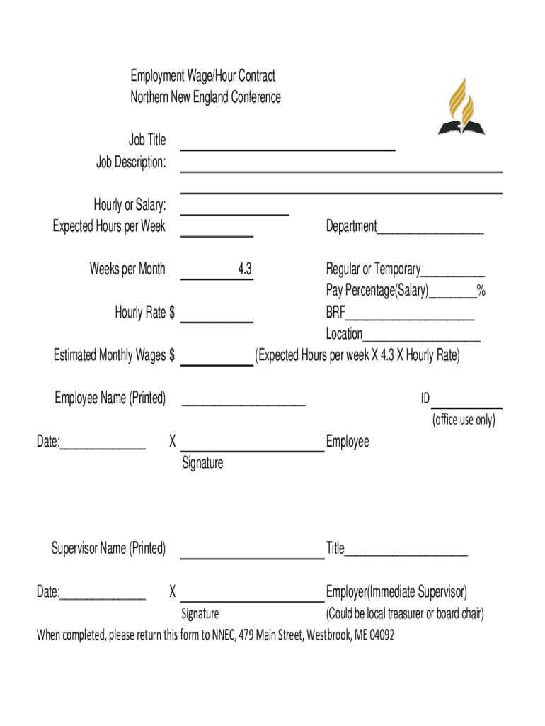 Employment Wage/Hour Contract Northern New England Conference Job Title Job Description: Hourly or Salary: Expected Hours per WeekDepartment___Weeks per Month4.3Hourly Rate $ Estimated Monthly Wages