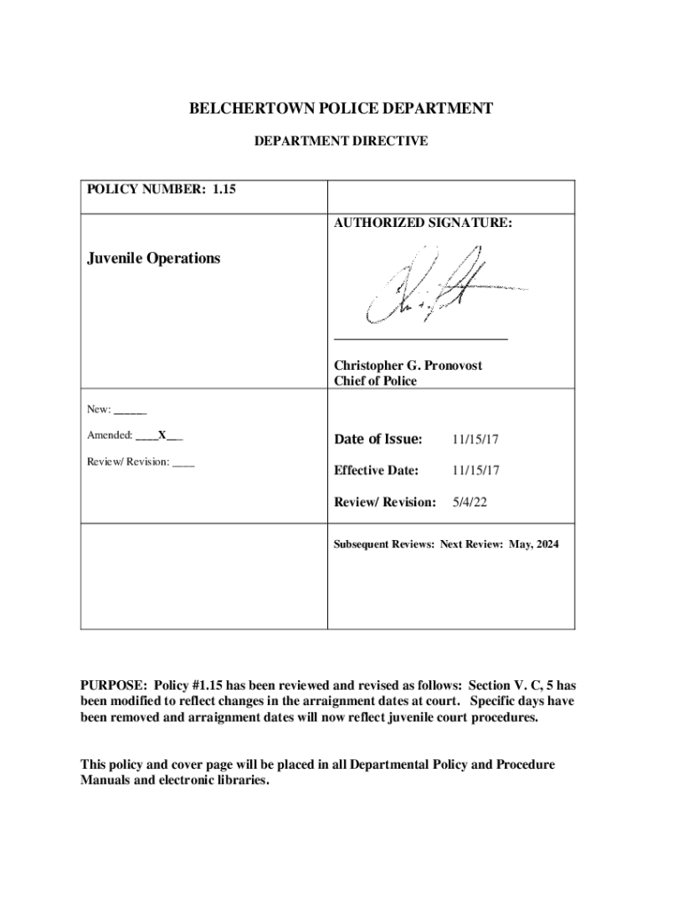 BELCHERTOWN POLICE DEPARTMENT DIRECTIVEPOLICY NUMBER: 1.15 AUTHORIZED SIGNATURE:Juvenile Operations___ Christopher G. Provost Chief of Police New: ___ Amended: ___X___ Review/ Revision: ___Date of