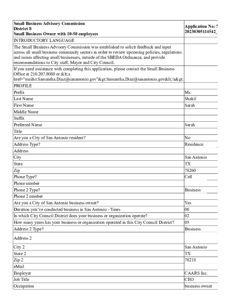 Small Business Advisory Commission Application No: N District 8 20230305114542_ Small Business Owner with 1050 employees INTRODUCTORY LANGUAGE The Small Business Advisory Commission was established