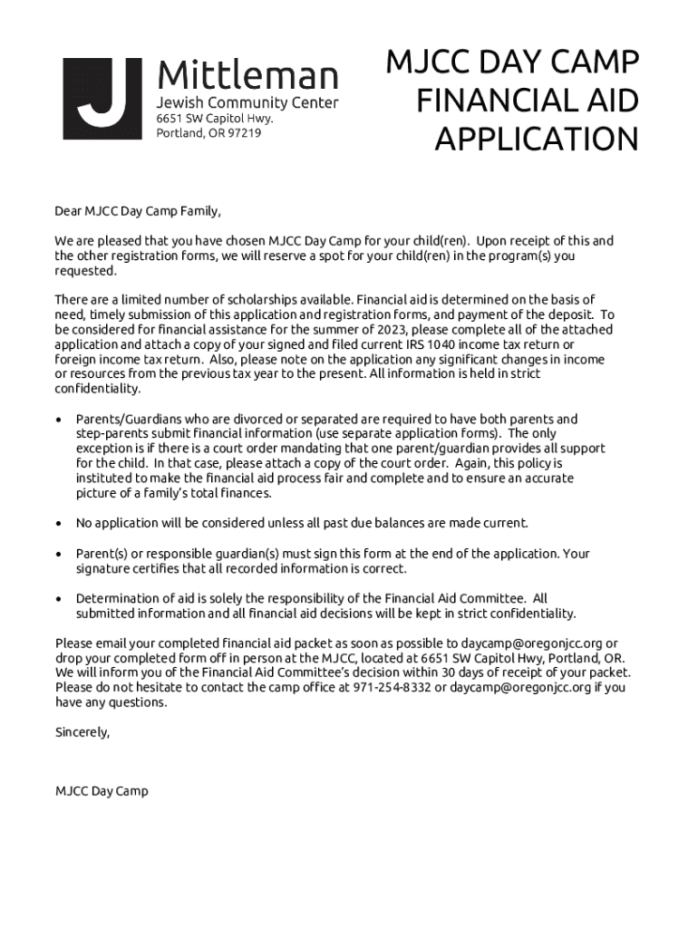 JCC DAY CAMP FINANCIAL AID APPLICATION Dear JCC Day Camp Family, We are pleased that you have chosen JCC Day Camp for your child(men). Upon receipt of this and the other registration forms, we will