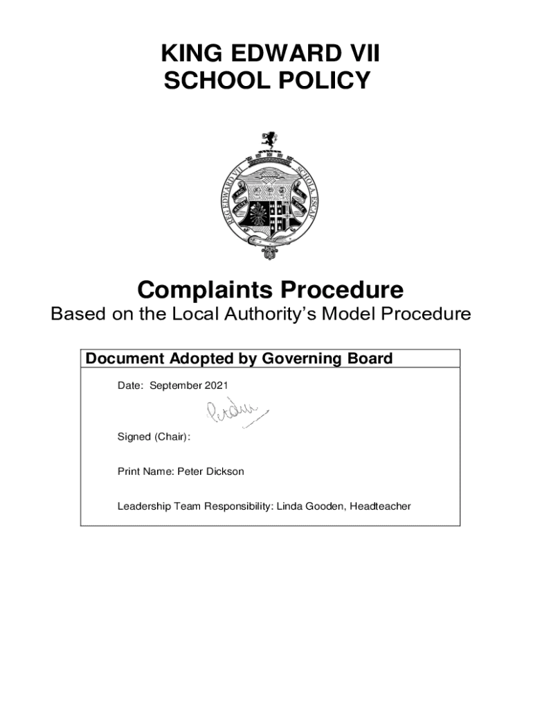 KING EDWARD VII SCHOOL POLICYComplaints Procedure Based on the Local Authorities Model Procedure Document Adopted by Governing Board Date: September 2021Signed (Chair):Print Name: Peter DicksonLeadership