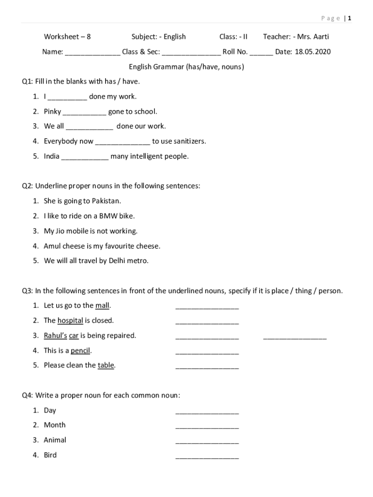 P age |1Worksheet 8Subject: Englishness: Teacher: Mrs. Wartime: ___ Class & Sec: ___ Roll No. ___ Date: 18.05.2020 English Grammar (has/have, nouns) Q1: Fill in the blanks with has / have. 1. I ___