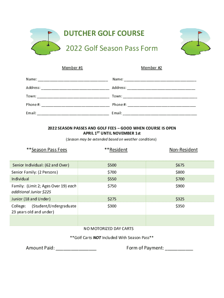 BUTCHER GOLF COURSE 2022 Golf Season Pass Form Member #1Member #2Name: ___Name: ___Address: ___ Address: ___ Town: ___ Town: ___ Phone #: ___ Phone #: ___ Email: ___ Email: ___2022 SEASON PASSES AND