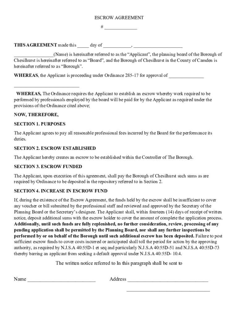 ESCROW AGREEMENT # ___THIS AGREEMENT made this ___ day of ___, ___ ___(Name) is hereinafter referred to as the Applicant, the planning board of the Borough of Chesilhurst is hereinafter referred to