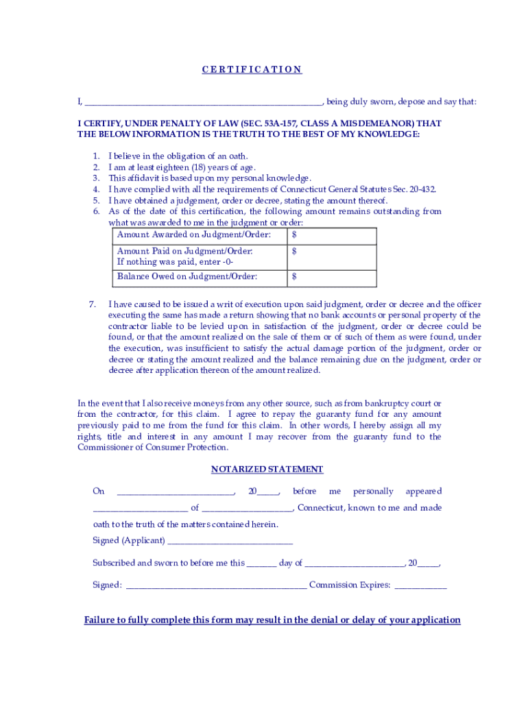 CERTIFICATION I, ___, being duly sworn, depose and say that: I CERTIFY, UNDER PENALTY OF LAW (SEC. 53A157, CLASS A MISDEMEANOR) THAT THE BELOW INFORMATION IS THE TRUTH TO THE BEST OF MY KNOWLEDGE: