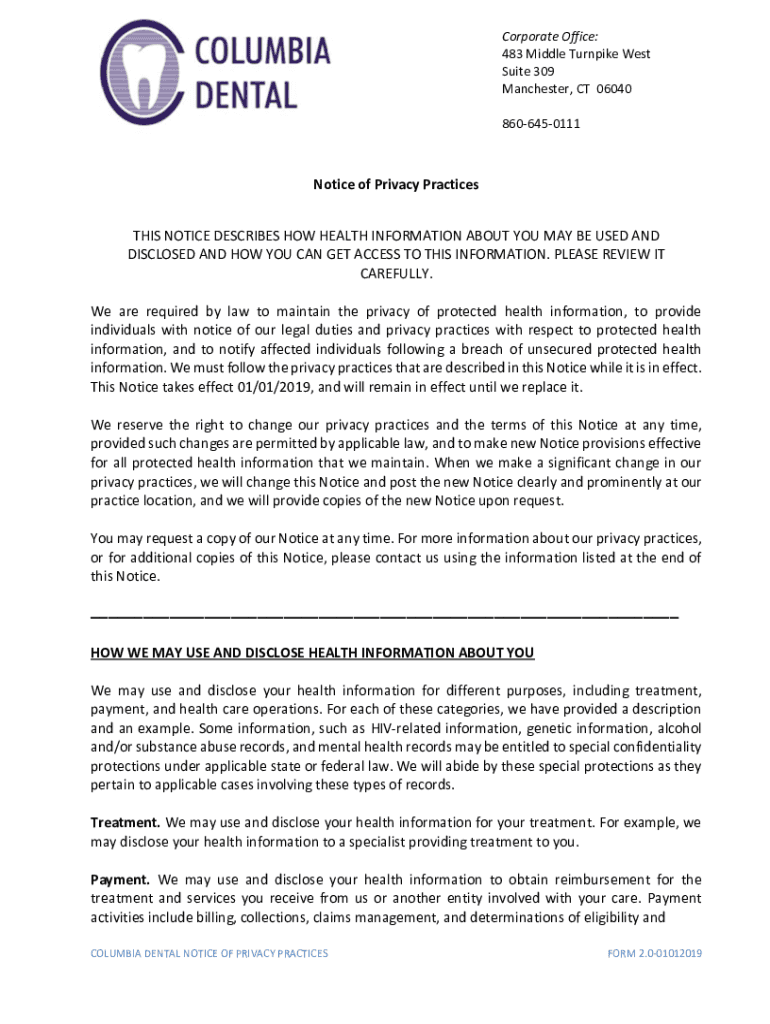Corporate Office: 483 Middle Turnpike West Suite 309 Manchester, CT 06040 8606450111Notice of Privacy Practices THIS NOTICE DESCRIBES HOW HEALTH INFORMATION ABOUT YOU MAY BE USED AND DISCLOSED AND
