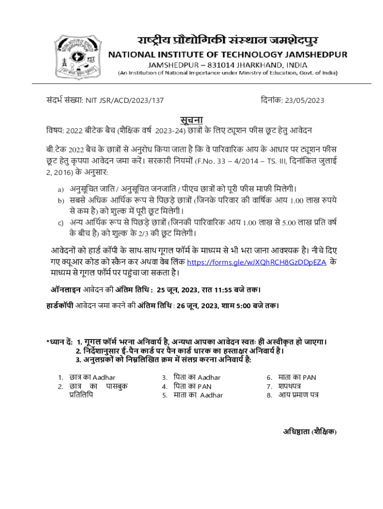 NIT JR/ACD/2023/137: 2022.(23/05/2023202324)2022 (F. No. 33 4/2014 TS. III,2, 2016):a)//b)(1.00) c)()1.005.002/3 https://forms.gle/wJXQhRCH8GzDDpEZA: 25, 2023,*: 1. 2. 3. 1. 2.: 26, 2023, Aadhar3.