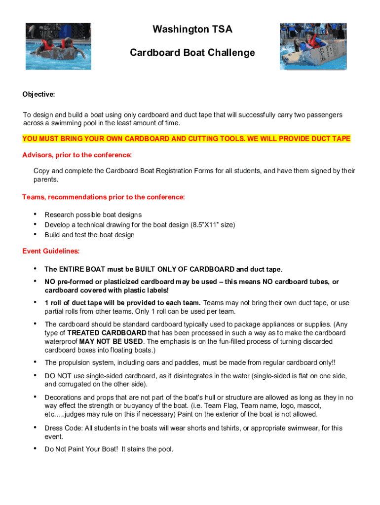 Washington TSA Cardboard Boat ChallengeObjective: To design and build a boat using only cardboard and duct tape that will successfully carry two passengers across a swimming pool in the least amount