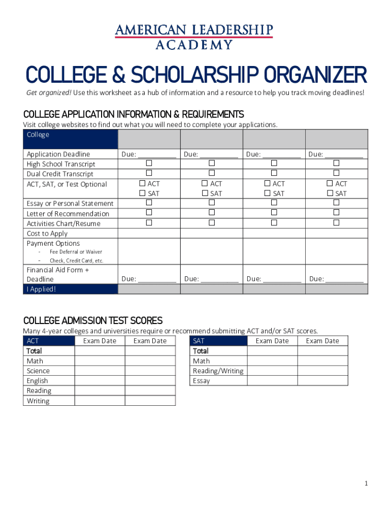 COLLEGE & SCHOLARSHIP ORGANIZER Get organized! Use this worksheet as a hub of information and a resource to help you track moving deadlines!COLLEGE APPLICATION INFORMATION & REQUIREMENTS Visit college