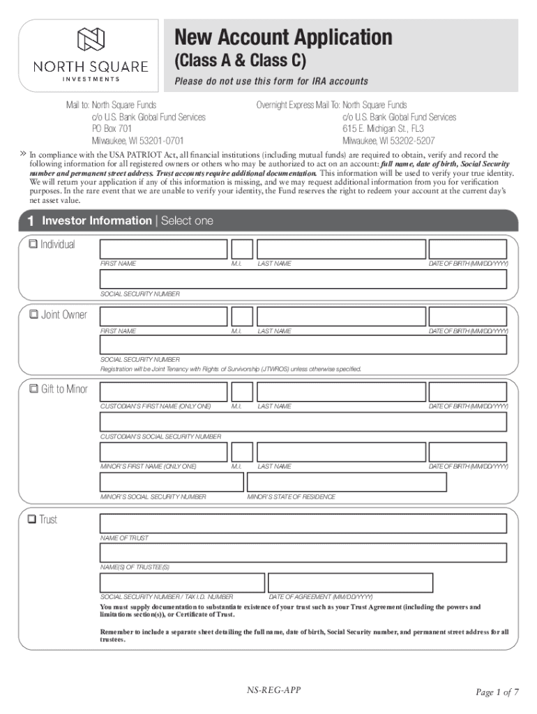 New Account Application (Class A & Class C)Please do not use this form for IRA accounts Mail to: North Square Funds/o U.S. Bank Global Fund Services PO Box 701Milwaukee, WI 532010701Overnight Express
