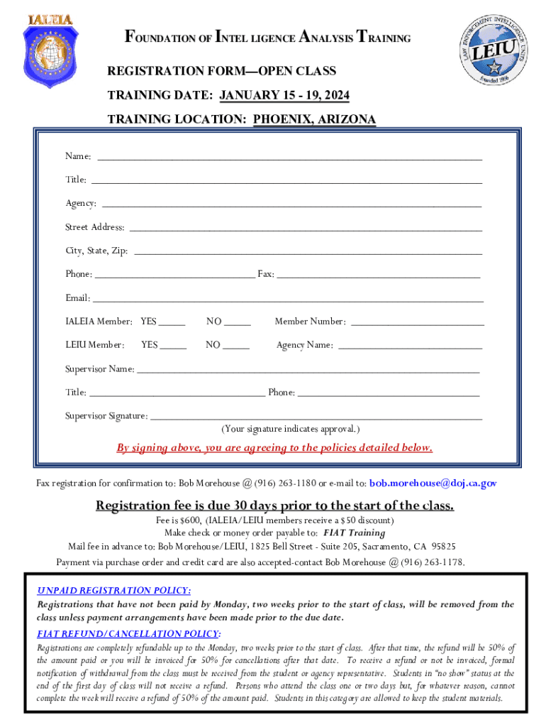 FOUNDATION OF INTEL LICENSE ANALYSIS TRAINING REGISTRATION FORMOSAN CLASS TRAINING DATE: JANUARY 15 19, 2024 TRAINING LOCATION: PHOENIX, ARIZONA Name: ___ Title: ___ Agency: ___ Street Address: ___