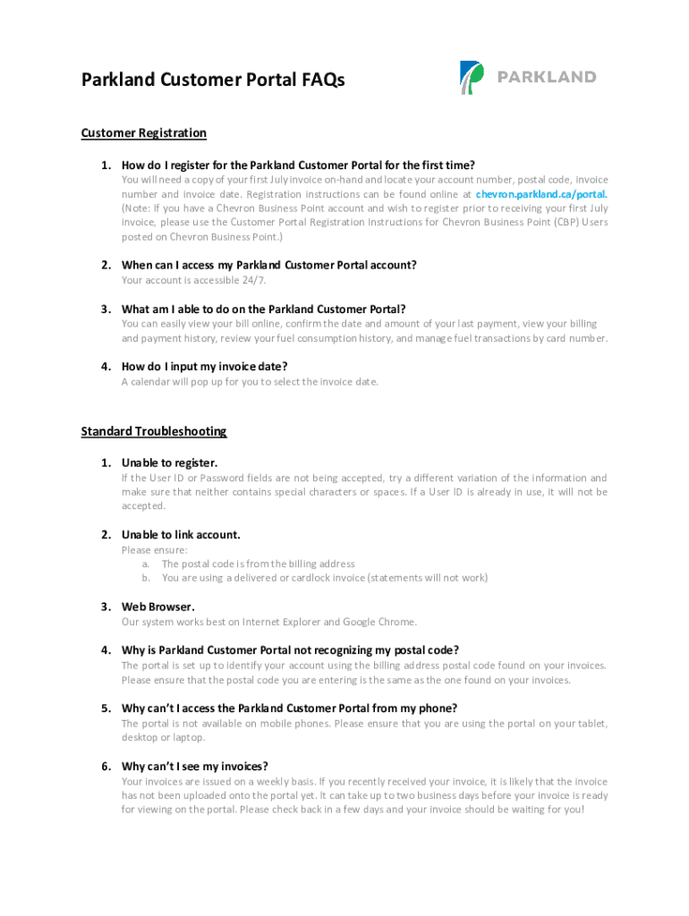 All customers who have access to the Parkland customer portal are required to read and follow the FAQs.