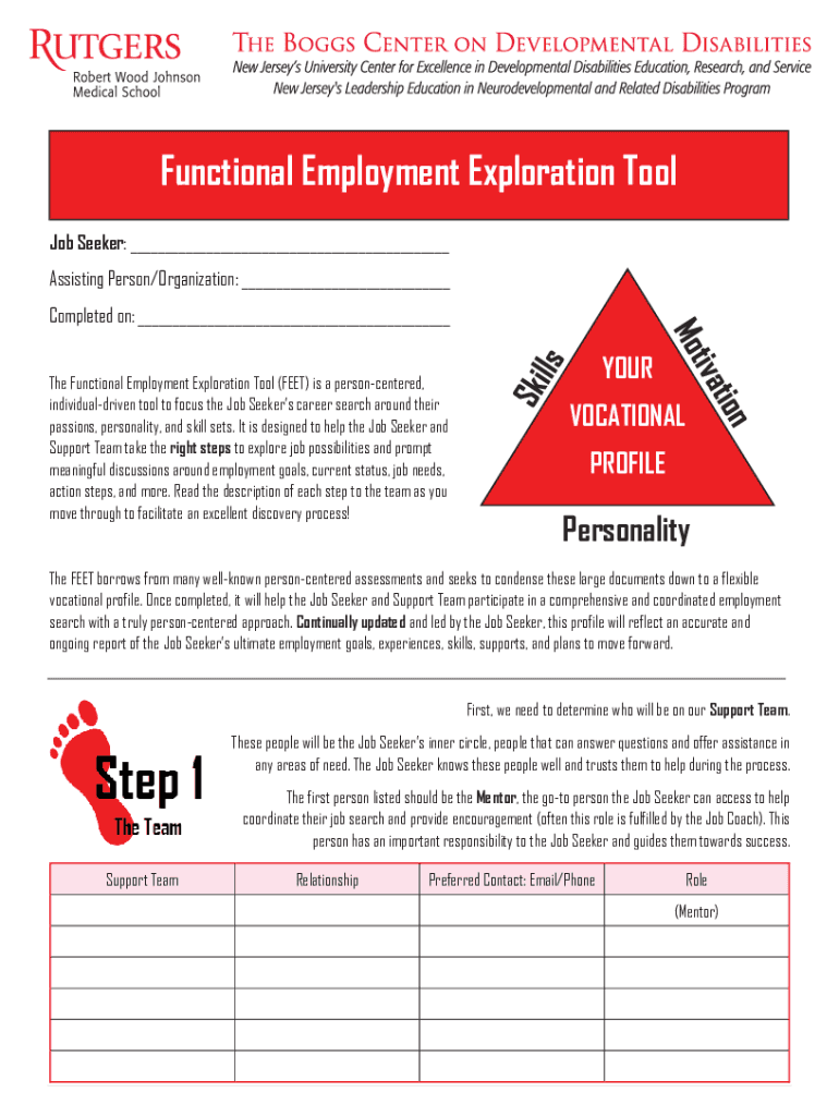 Functional Employment Exploration Tool Job Seeker: ___ Assisting Person/Organization: ___ Completed on: ___ The Functional Employment Exploration Tool (FEET) is a person centered, individual driven