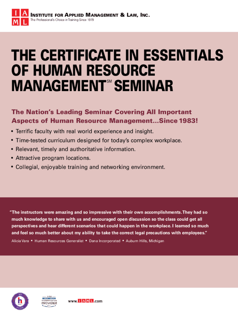 If A M LInstituteforApplied Management & Law, Inc. The Professionals Choice in Training Since 1979THE CERTIFICATE IN ESSENTIALS OF HUMAN RESOURCE MANAGEMENT SEMINAR SMT he Nations Leading Seminar