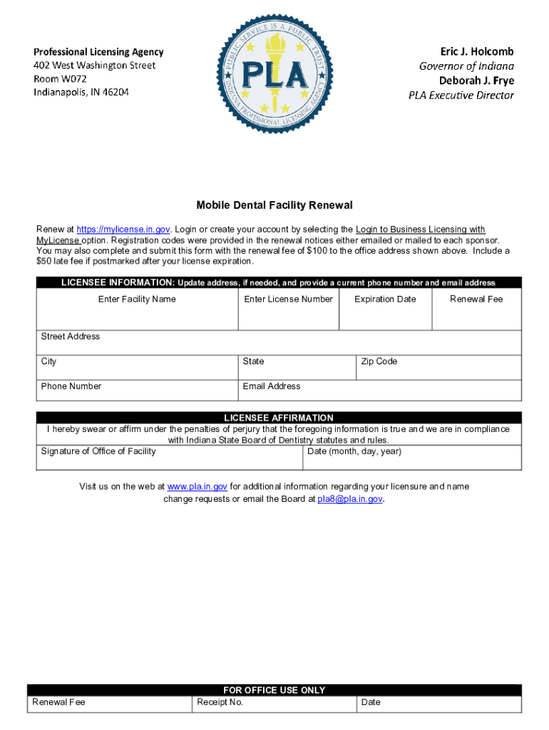 Mobile Dental Facility Renewal Renew at https://mylicense.in.gov. Login or create your account by selecting the Login to Business Licensing with License option. Registration codes were provided in