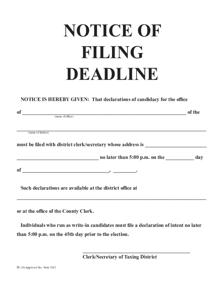 NOTICE OF FILING DEADLINE NOTICE IS HEREBY GIVEN: That declarations of candidacy for the office of ___ of the (name of office)___ (name of district)must be filed with district clerk/secretary whose