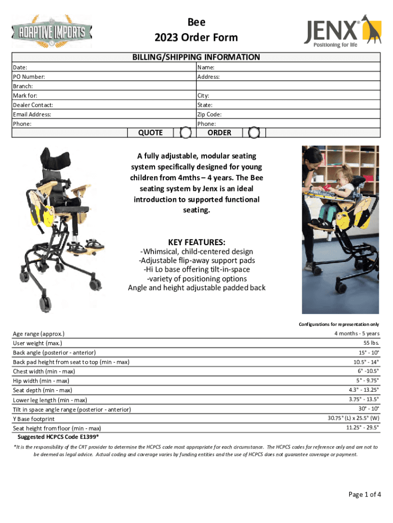 Bee 2023 Order Form BILLING/SHIPPING Informational: PO Number: Branch: Mark for: Dealer Contact: Email Address: Phone:Name: Address:Austerity: State: Zip Code: Phone:ORDER fully adjustable, modular