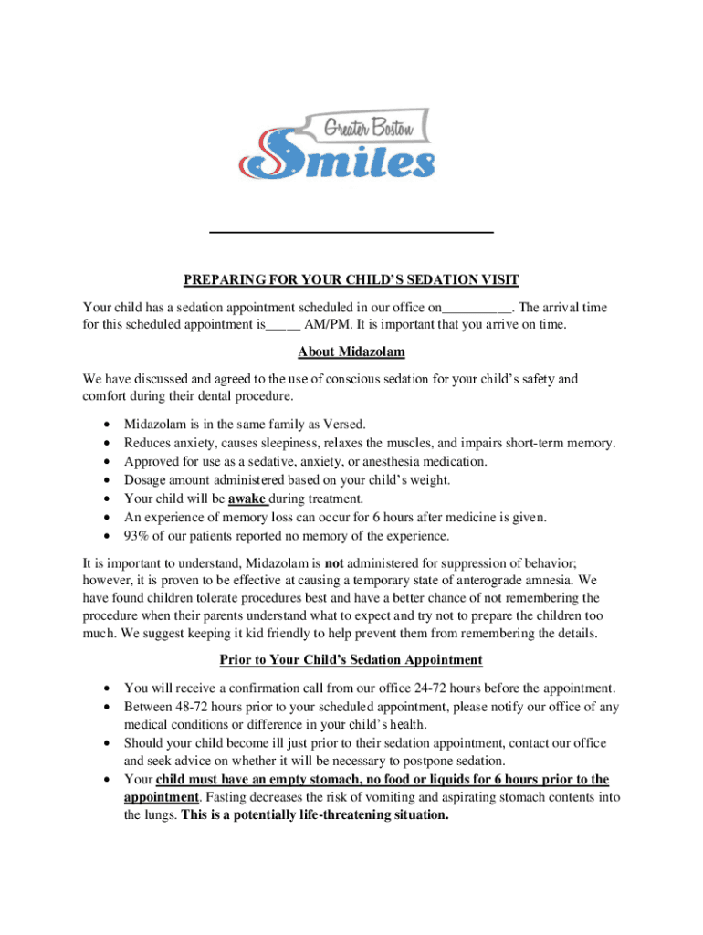 PREPARING FOR YOUR CHILD SEDATION VISIT Your child has a sedation appointment scheduled in our office on___. The arrival time for this scheduled appointment is___ AM/PM. It is important that you arrive