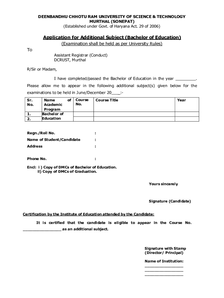 DEENBANDHU CHH OTU RAM UNIVERSITY OF SCIENCE & TECHNOLOGY MARTIAL (CONCEPT) (Established under Govt. of Haryana Act. 29 of 2006)Application for Additional Subject (Bachelor of Education) (Examination