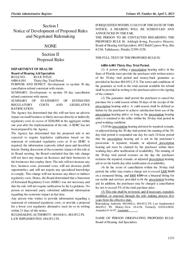 Florida Administrative RegisterSection I Notice of Development of Proposed Rules and Negotiated Rule making NONE Section II Proposed Rules DEPARTMENT OF HEALTH Board of Hearing Aid Specialists RULE