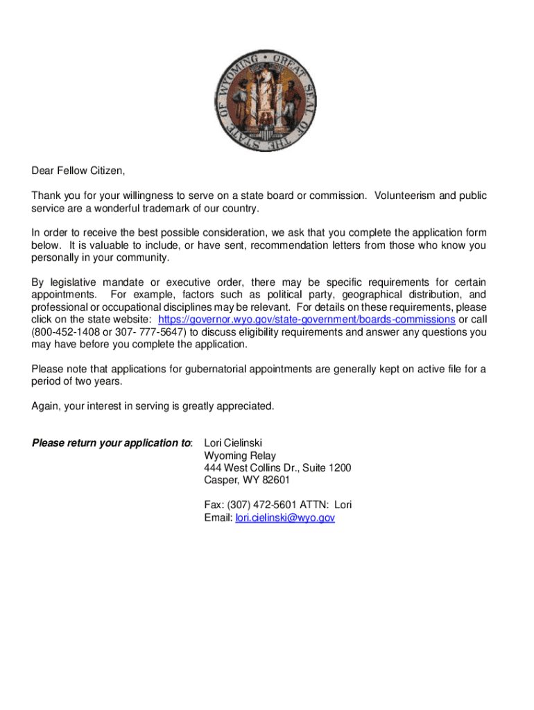 Dear Fellow Citizen, Thank you for your willingness to serve on a state board or commission. Volunteerism and public service are a wonderful trademark of our country. In order to receive the best