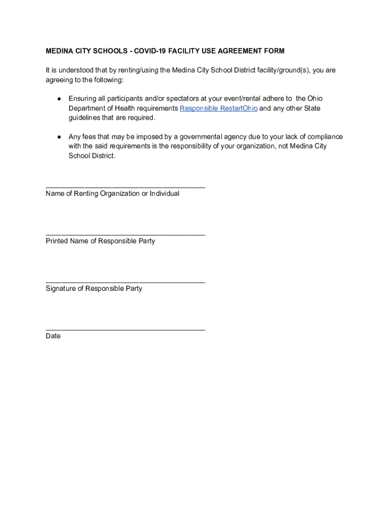 MEDINA CITY SCHOOLS COVID-19 FACILITY USE AGREEMENT FORM It is understood that by renting/using the Medina City School District facility/ground(s), you are agreeing to the following: Ensuring all