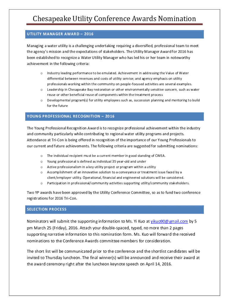To fill out Chesapeake Utility Conference Awards, companies and professionals must provide detailed information about their achievements and contributions to the utility industry.