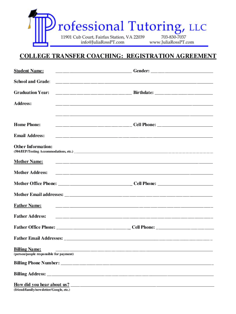 COLLEGE TRANSFER COACHING: REGISTRATION AGREEMENT Student Name:___ Gender: ___School and Grade:___Graduation Year:___ Birthdate: ___Address:___ ___Home Phone:___ Cell Phone: ___Email Address:___Other