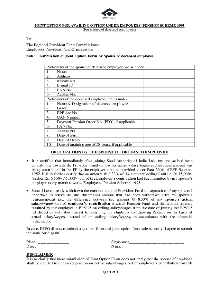 JOINT OPTION FOR AVAILING OPTION UNDER EMPLOYEES PENSION SCHEME1995 (For spouse of deceased employees)To The Regional Provident Fund Commissioner Employees Provident Fund Organization Sub : Submission