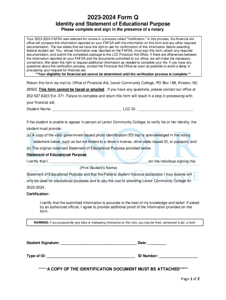 20232024 Form Q Identity and Statement of Educational Purpose Please complete and sign in the presence of a notary. Your 20232024 FAFSA was selected for review in a process called Verification. In