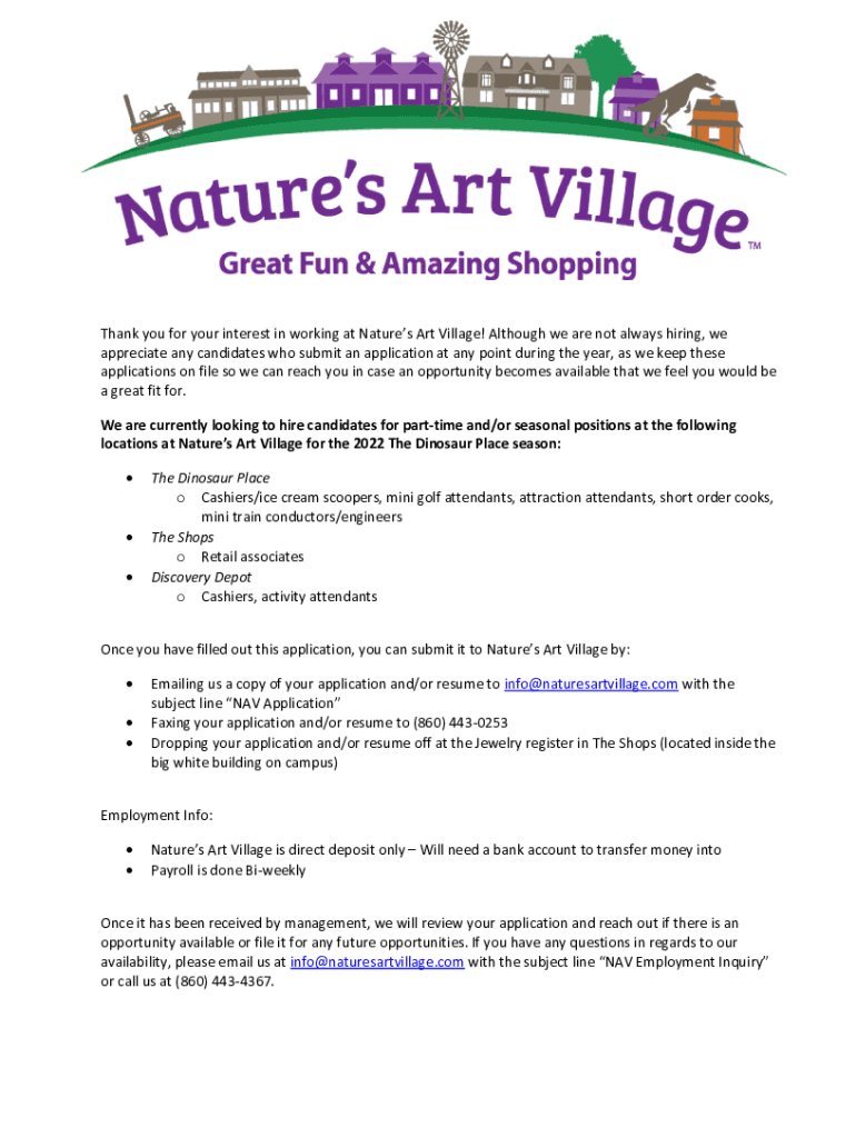 Thank you for your interest in working at Natures Art Village! Although we are not always hiring, we appreciate any candidates who submit an application at any point during the year, as we keep these