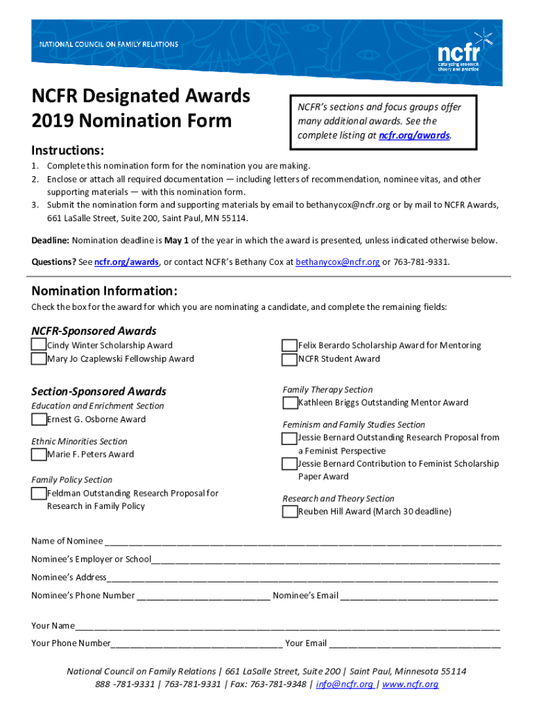 CFR Designated Awards 2019 Nomination Formicas sections and focus groups offer many additional awards. See the complete listing at ncfr.org/awards. Instructions: 1. Complete this nomination form for