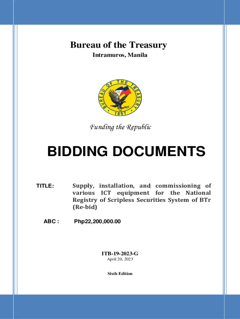 Bureau of the Treasury Intramural, ManilaFunding the RepublicBIDDING DOCUMENTS TITLE:ABC :Supply, installation, and commissioning of various ICT equipment for the National Registry of Scripless Securities