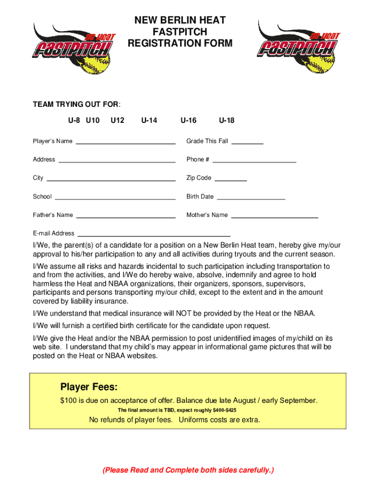 Obtain a registration form from the New Berlin Heat Baseball organization.