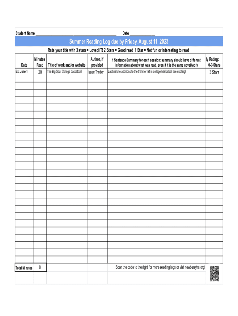 Student Name ___Date ___Summer Reading Log due by Friday, August 11, 2023, Rate your title with 3 stars Loved IT! 2 Stars Good read 1 Star Not fun or interesting to read Datelines Reader: June 120Total