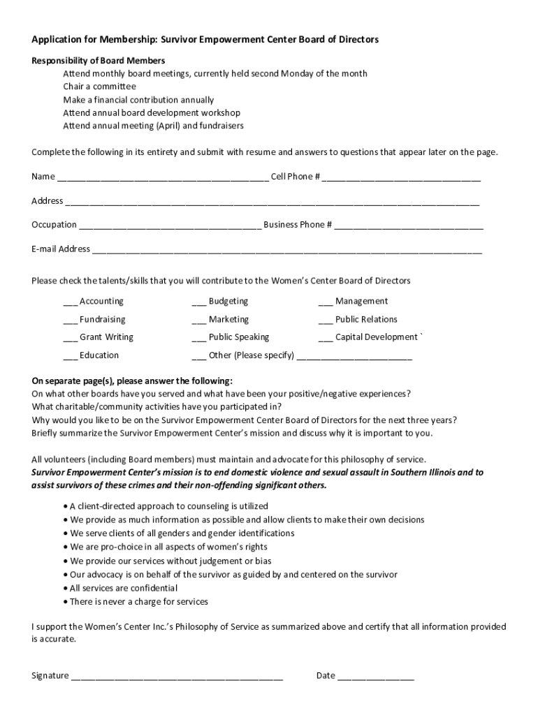 Application for Membership: Survivor Empowerment Center Board of Directors Responsibility of Board Members Attend monthly board meetings, currently held second Monday of the month Chair a committee