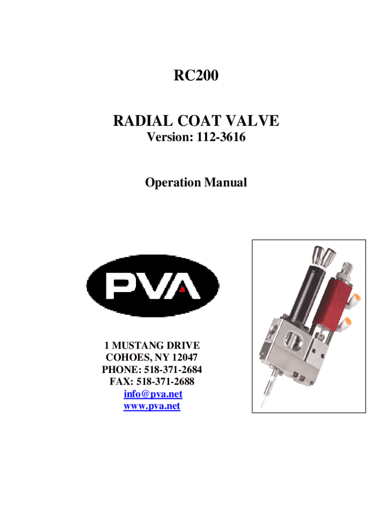RC200 RADIAL COAT VALVE Version: 1123616Operation Manual1 MUSTANG DRIVE COHOS, NY 12047 PHONE: 5183712684 FAX: 5183712688 info@pva.net www.pva.netRC200 Front Closing Radial Coat Valve Thank you for