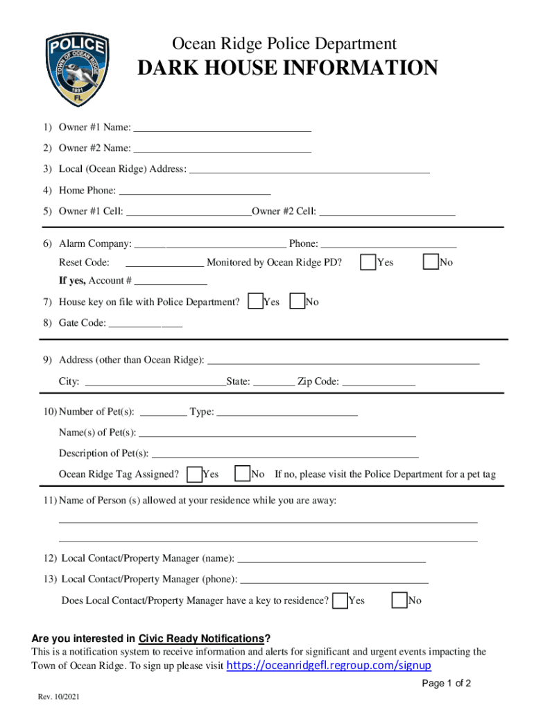 Ocean Ridge Police Departmental HOUSE INFORMATION 1) Owner #1 Name: ___ 2) Owner #2 Name: ___ 3) Local (Ocean Ridge) Address: ___ 4) Home Phone: ___ 5) Owner #1 Cell: ___Owner #2 Cell: ___ 6) Alarm